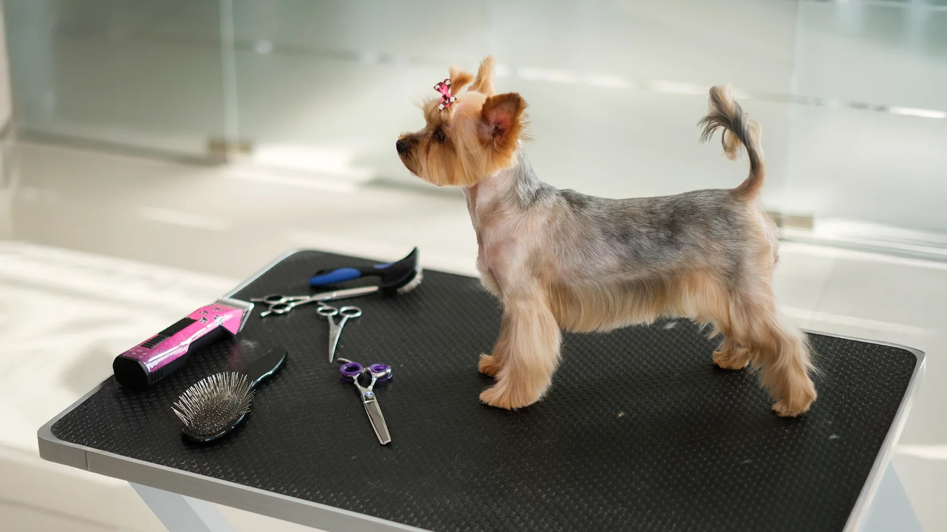 A complete spa experience including a premium bath, blow-dry, brush-out, custom haircut or de-shedding treatment, nail trimming, ear cleaning, paw and sanitary trim, and finishing spray — plus a stylish bow or bandana.